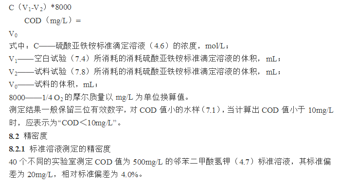 7.1 對于COD值小于50mg/L的水樣,應(yīng)采用低濃度的重鉻酸鉀標準溶液(4.5.2)氧化,加熱回流以后,采用低濃度的硫酸亞鐵銨標準溶液(4.6.4)回滴。