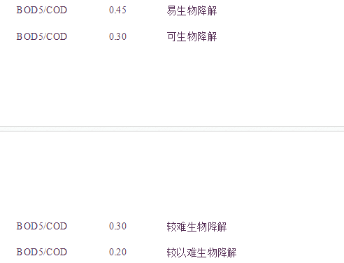 B/C是BOD5與COD比值的縮寫,該比值可以表示廢水的可生化降解特性。如果CODNB表示COD中的不可生物降解部分,則廢水中不可為微生物生物降解的有機物所占的比例可用CODNB/COD表示。  BOD5/COD與CODNB/COD之間有如下表所示的關系:  CODNB/COD 0.1 0.2 0.3 0.4 0.5 0.6 0.7 0.8  BOD5/COD 0.52 0.46 0.41 0.35 0.29 0.23 0.17 0.12