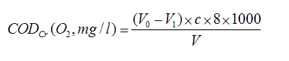 式中,c——硫酸亞鐵銨溶液濃度,mol/l;       V0——滴定空白樣量,ml;       V1——滴定水樣量,ml;       V——水樣體積,5ml。