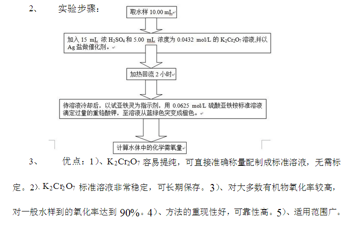 催化作用下氧化水體中的還原性物質,過量的重鉻酸鉀以試亞鐵靈(鄰二氮菲-亞鐵絡合物)作指示劑,用硫酸亞鐵銨溶液返滴定,根據用量算出水樣中還原性物質消耗氧的量。