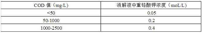 本方法可以測(cè)定地表水、生活污水、工業(yè)廢水(包括高鹽廢水)的化學(xué)需氧量,水樣因其化學(xué)需氧量的值有高有低,因此在消解時(shí)應(yīng)該選擇不同濃度的重鉻酸鉀消解液進(jìn)行消解。參考下表選擇消解液。
