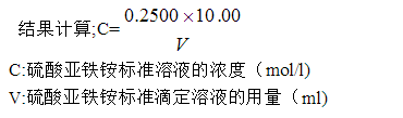 硫酸亞鐵銨溶液的標(biāo)定:準(zhǔn)確吸取10.00ml重鉻酸鉀標(biāo)準(zhǔn)溶液于500ml的錐形瓶中,加水稀釋**110ml左右,緩慢加入30ml濃硫酸,混勻。冷卻后,加入3滴試亞鐵靈指示劑,用硫酸亞鐵銨溶液滴定,溶液的顏色由黃色經(jīng)藍(lán)綠色**紅褐色即為滴定終點(diǎn)。