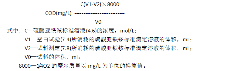 7.5 空白試驗:按相同步驟以20.0mL水代替試料進行空白試驗,其余試劑和試料測定與(7.8)相同,記錄下空白滴定時消耗硫酸亞鐵銨標準溶液的毫升數(shù)V1。 7.6 校核試驗:按測定試料(7.8)提供的方法分析20.0mL鄰苯二甲酸氫鉀標準溶液(4.7)的COD值,用以檢驗操作技術及試劑純度。
