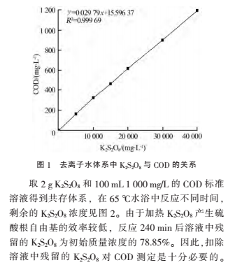 在 去離子水體系中 K2S2O8 質量濃度與其造成的 COD 變化量呈顯著的正相關關系。而 K2S2O8 雖比