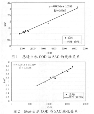 UV254是水樣在 254nm處的紫外吸光值, 利用其和水樣 COD的相關性 , 間接反映水體中一類有機物的含量。隨著水中懸浮物質的去除, 濁度降低, 水樣的 UV254 和 COD的線性相關系數逐漸提高。如果水樣混濁, 可采用 0.45um的濾膜對水樣進行過濾處理 ,這樣處理的缺點在于水樣中的有機物若是以顆粒形態存在或附著在顆粒表面, 經過濾后會引起測定的偏差。 SAC為水樣在 254nm和365nm波長下紫外吸光值的差值, SAC方法的優點在于用 365nm波長下吸光值來修正濁度的影響。 UV254 、SAC作為 COD測定的替代指標有一定的局限性, 只適合于濁度低、的連續 3個月的監測數據, 數據分析見圖 1。表 5 為克石化公司工業水車間隔油出水 UV254 和 COD 的連續監測數據 , 數據分析見圖 2。從分析結果來看 ,相關性是比較理想的。