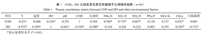 海水中 DO 的主要來源是大氣中氧的溶解,其次來自于海洋生物,尤其是浮游植物光合作用時所放出的氧。表 1 中,DO 值主要與溫度、pH、COD、石油烴、Chl-a、大腸菌群、鹽度等指標顯著相關,相關系數分別為-0.475、0.441、-0.524、-0.5、-0.543、-0.372、0.394。DO 與溫度明顯負相關, 符合水體中溶解氧與溫度分布呈反比例的一般規律(見表 1) 。DO 與 pH 顯著正相關,則反映了有機污染物氧化分解,消耗氧氣,并導致 pH 值下降的過程。DO 與石油烴明顯負相關,可能與石油烴降解耗氧及石油烴污染易在水面形成油膜,影響水-氣界面氧氣交換的作用有關。盡管亞熱帶河口海區由于受溫度、光照、及高營養鹽含量等因素影響,往往具有較高的初級生產力(高 Chl-a值) ,浮游植物在光合作用中釋放出大量氧氣,但營養鹽水平較高的海區,其耗氧污染物負荷也較高,污染物降解耗氧速度遠大于生物作用生成氧氣的速度, 這也是 DO 與 Chl-a 呈現負相關的主要原因。大腸菌群指標常用來表征微生物降解有機物能力,有機污染程度越高,大腸菌群則越高,這也解釋了 DO 與大腸菌群顯著負相關的主要原因 [21] 。DO 與鹽度顯著正相關,主要為鹽度越高,則越靠近外海,其污染負荷越小,而 DO 含量則越高。